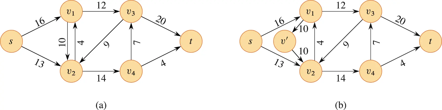 在传统的流网络中,若存在边 ,则图中不允许出现反方向的边,即 。但现实世界中经常会遇到中间商之间互相交易的情况,会出现如下 (a) 的情况。我们称边 和边 是 反平行 (antiparallel) 的。图 (b) 提供了一个简单的转换网络,使得网络符合传统流网络的限制条件。它通过加入一个新结点 将其中一条边分解为两段,并且设计两条新设立的边(输入 和 输出的边)与原来分解的边的容量相同。