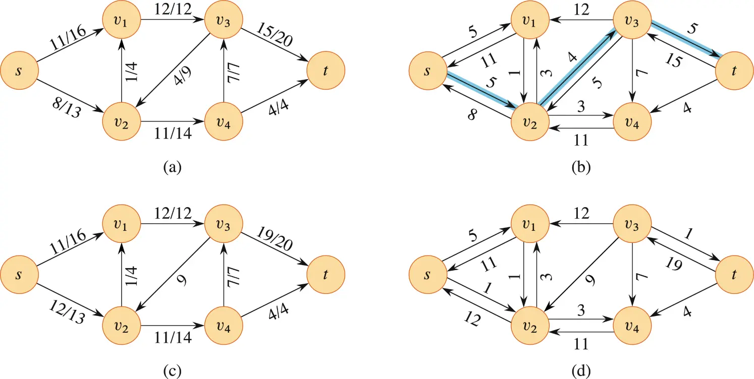 回到我们之前的一个例子中,图 (a) 是一个流网络 ,此时 ,图 (b) 则是它的残存网络 。我们增加了图 (c) 和图 (d)。