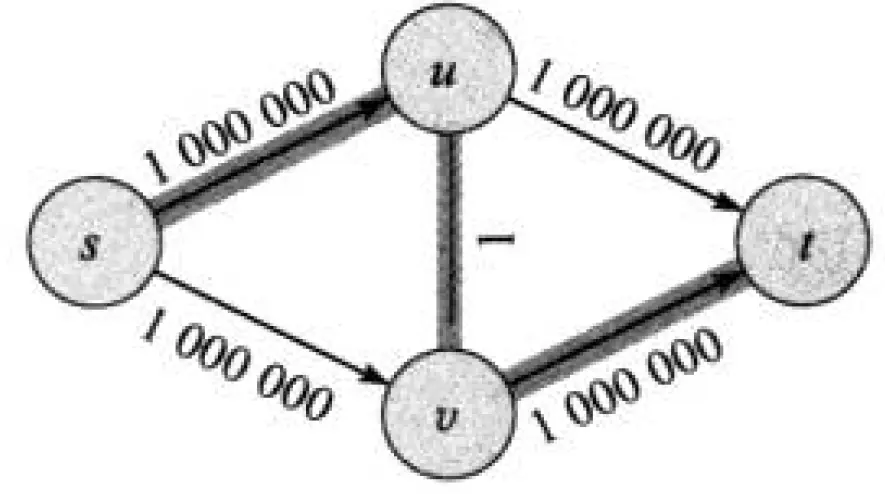 在通用的 Ford-Fulkerson 方法中,我们说“找一条增广路径”。但是没说怎么找。 如果运气不好,这会导致灾难性的后果。