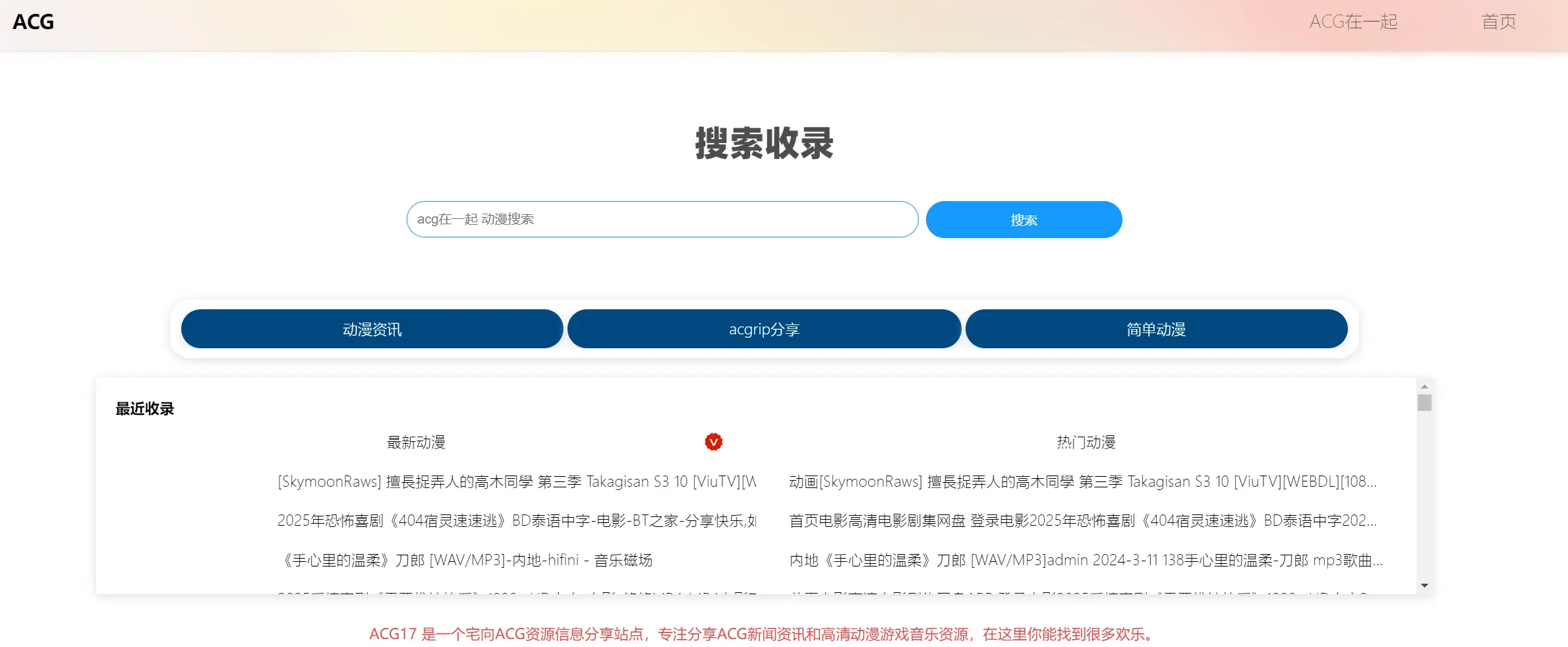 ACG在一起是一个专注于ACG文化的综合性资源分享平台,致力于为广大二次元爱好者提供最新鲜的动漫资讯、最高清的动漫游戏音乐资源。它聚合了多个优质动漫分享站点的下载资源,并整合了多个动漫资源站,为用户提供了最完整的动漫资源。