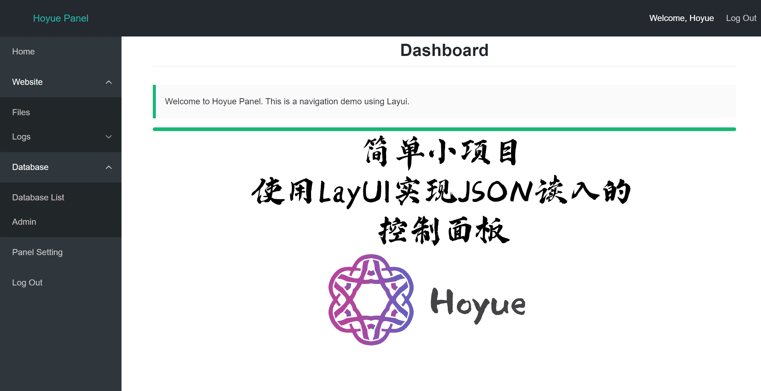 <!-- LayUI layout --> <div class="layui-layout layui-layout-admin"> <!-- Header section --> <div class="layui-header"> <div class="layui-logo">Hoyue Panel</div> <ul class="layui-nav layui-layout-right"> <li class="layui-nav-item"> Welcome, Hoyue </li> <li class="layui-nav-item"><a href="#" onclick="out_msg()">Log Out</a></li> </ul> </div> <!-- Menu list --> <div class="layui-side layui-bg-black"> <div class="layui-side-scroll"> <ul id="menu" class="layui-nav layui-nav-tree" lay-filter="meun"> </ul> </div> </div> <!-- Tab container --> <div class="layui-tab" lay-filter="demo" lay-allowclose="true" style="margin-left: 200px;"> <ul class="layui-tab-title"></ul> <div class="layui-tab-content"></div> </div> </div>其中,菜单栏的id为menu,便于我之后通过JSON导入。